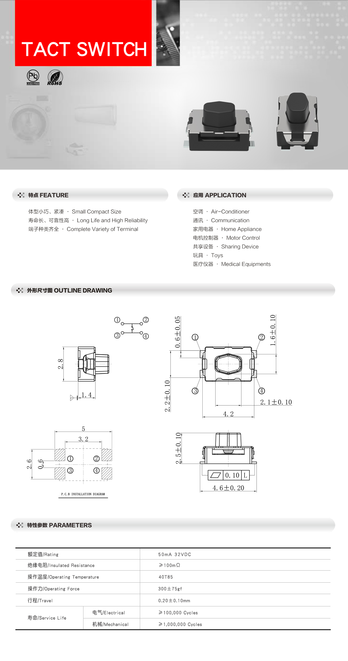 Mini系列 2.8*4.2mm轻触开关 平脚贴片式微型按键开关