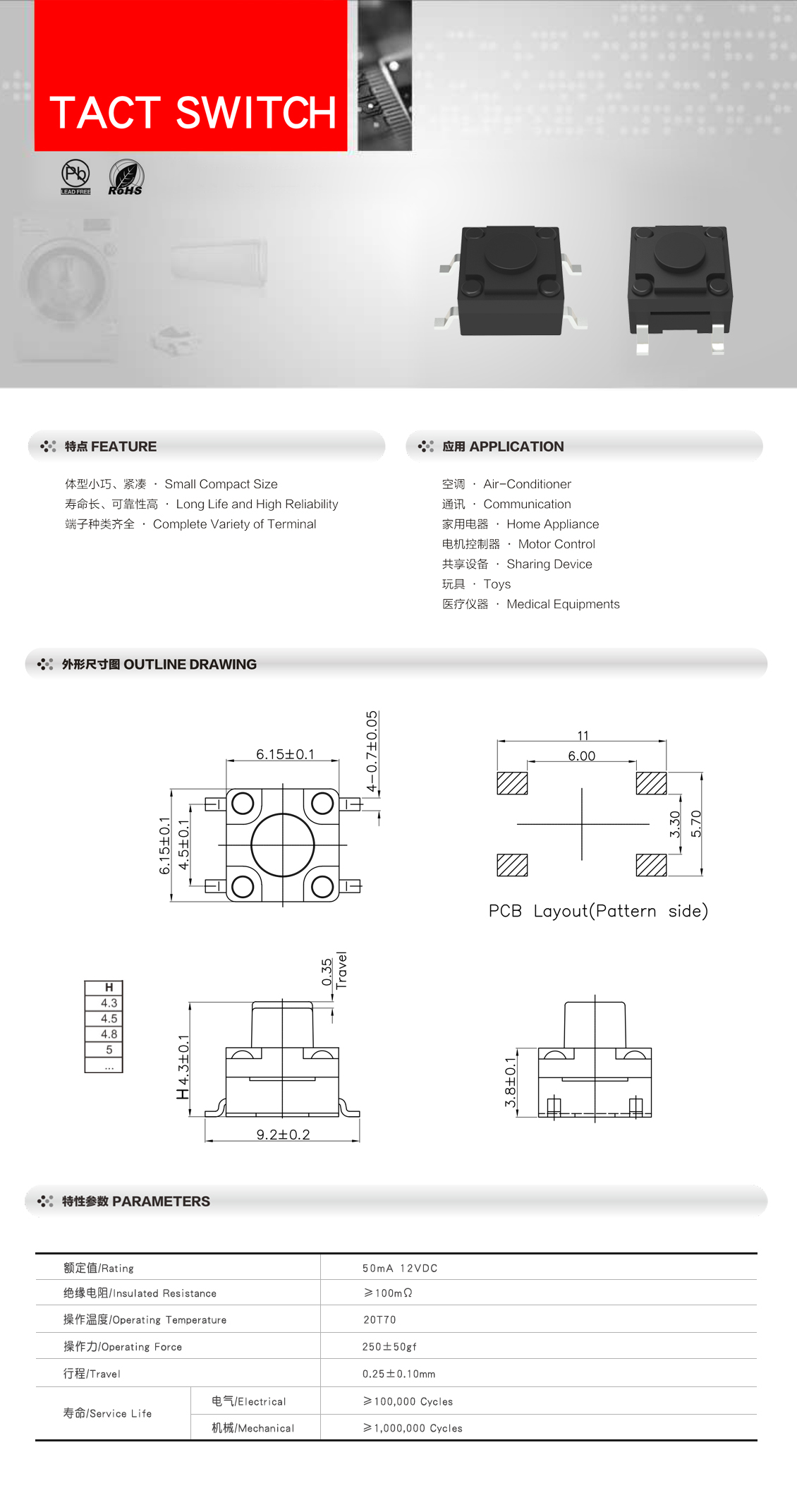 6*6系列 6.mm轻触开关 平脚贴片式微型按键开关