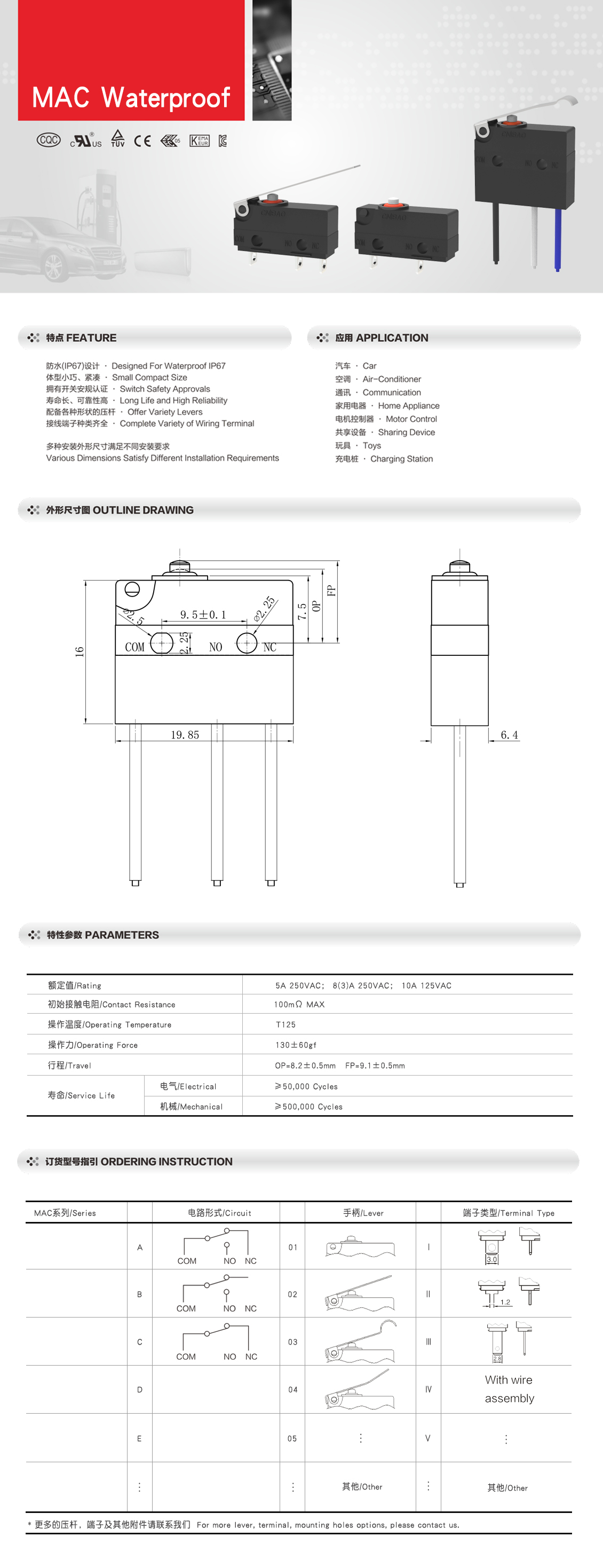 MAC系列 防水微动开关 Ⅰ型外壳 可焊线包塑
