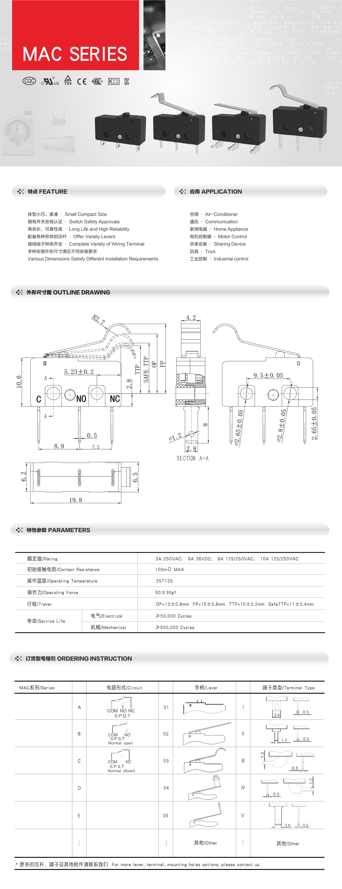 MAC系列 微动开关 侧PCB端子脚 多规格压杆