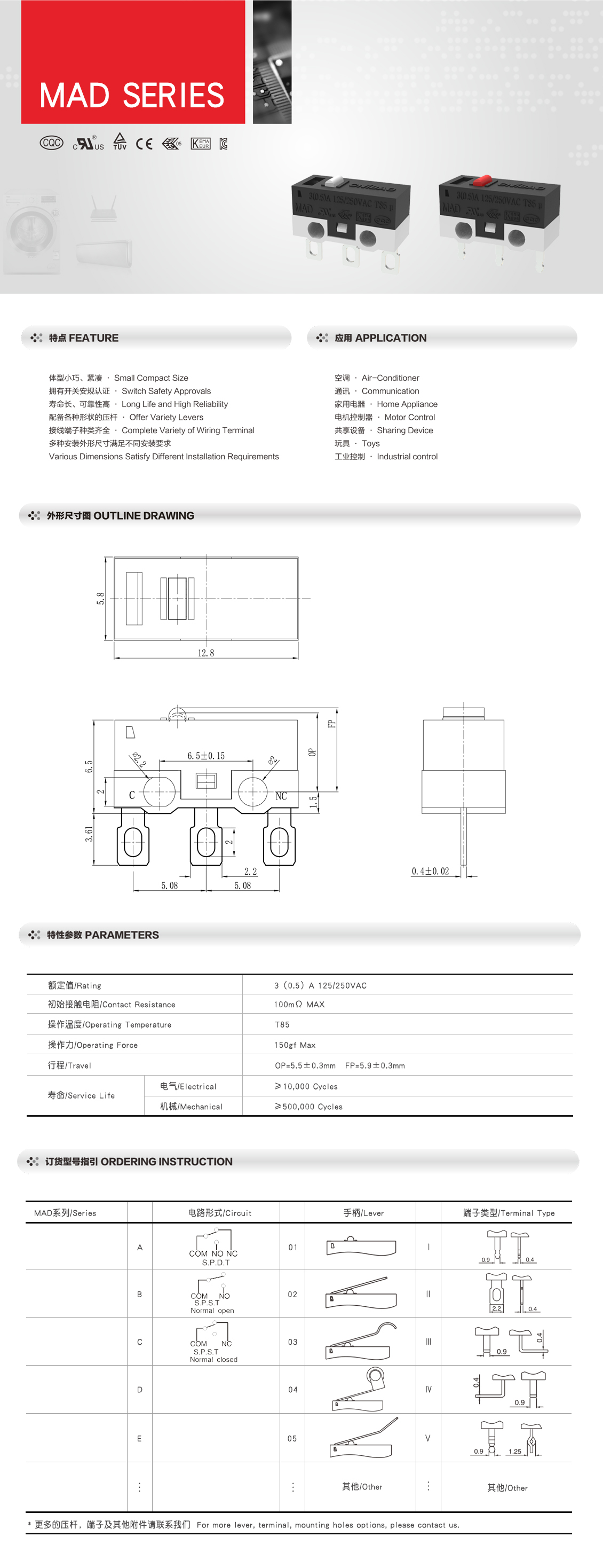 MAD系列 微动开关 焊线端子脚 多规格压杆