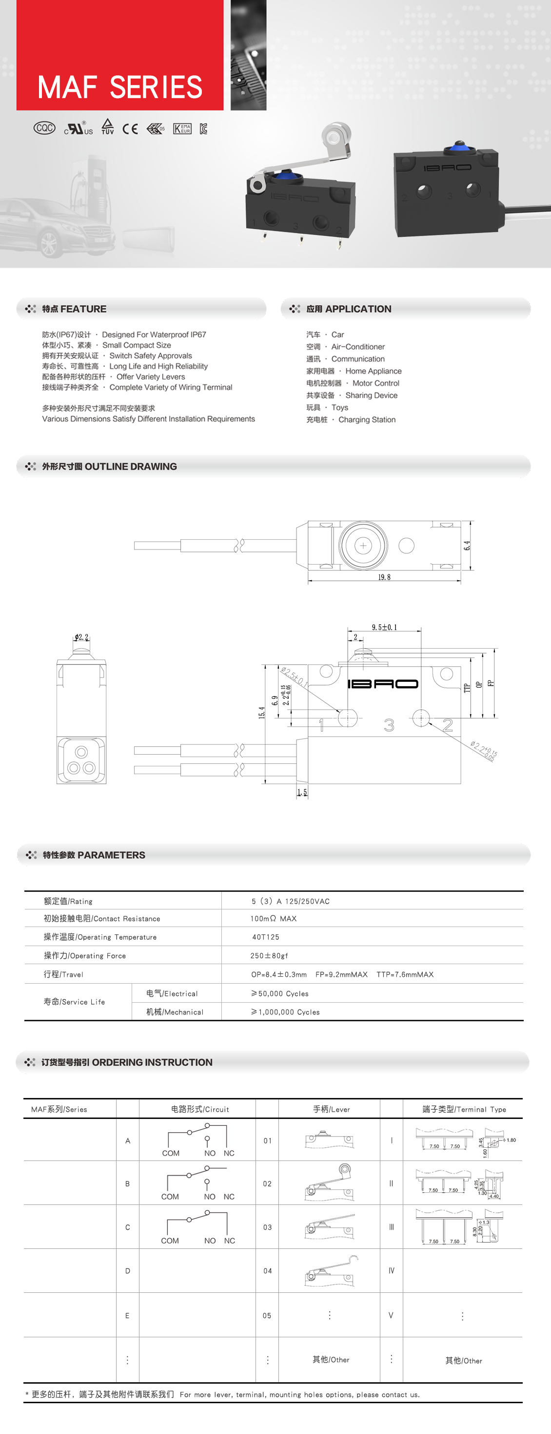 MAF系列 防水微动开关 Ⅰ型外壳 可焊线包塑