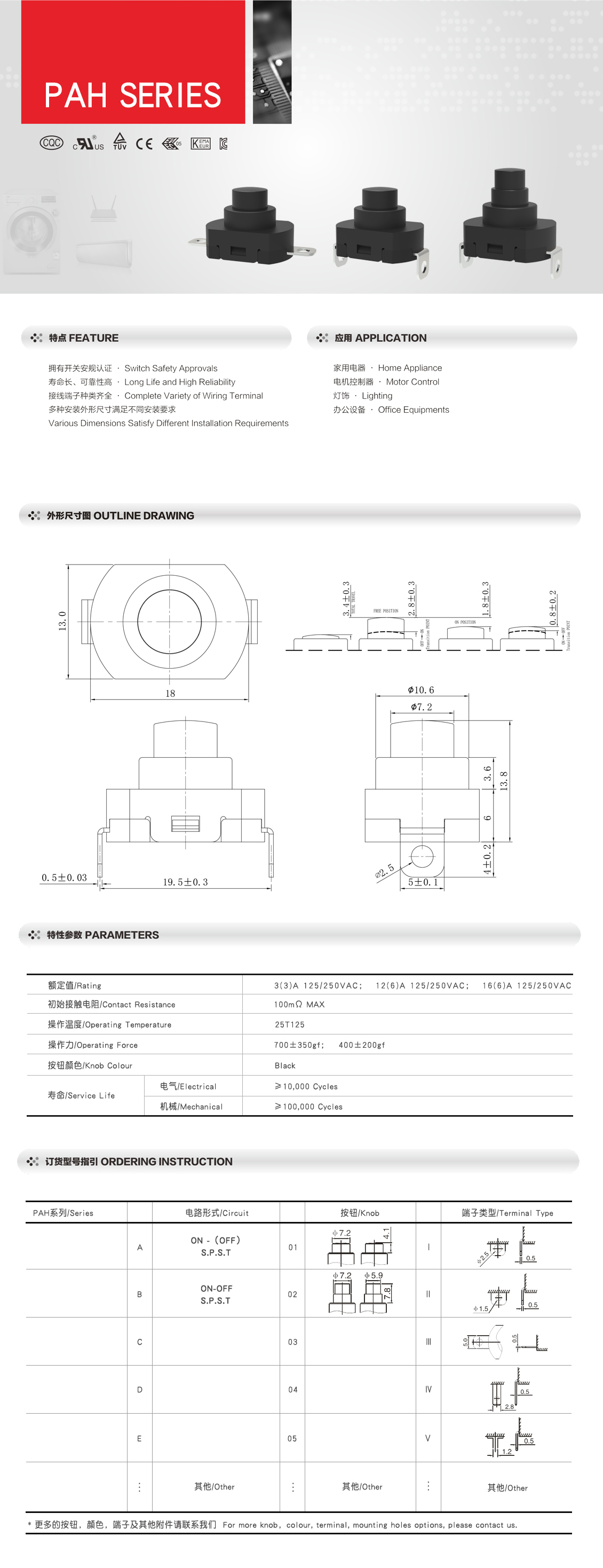 PAH系列 按钮开关 带锁/无锁手电筒用按键开关 侧出端子
