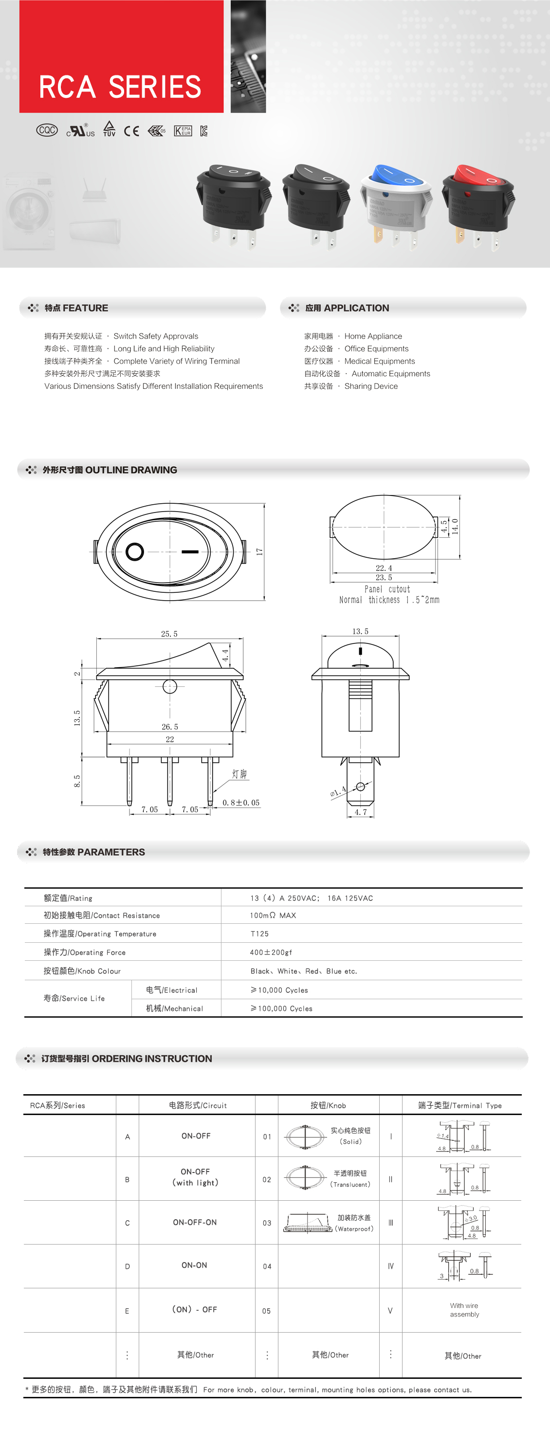 RCA系列 船型开关 椭圆形翘板开关3档 多规格按钮端子