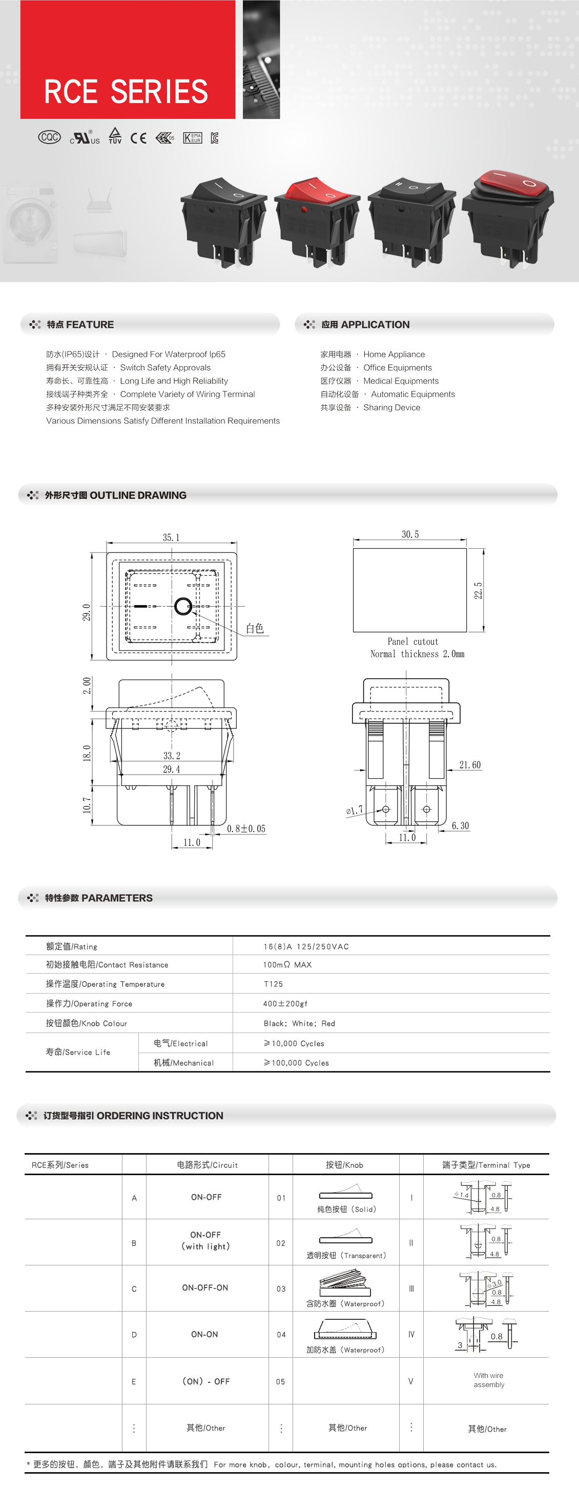 RCE系列 船型开关 方形翘板开关KCD4 双刀双掷可带灯