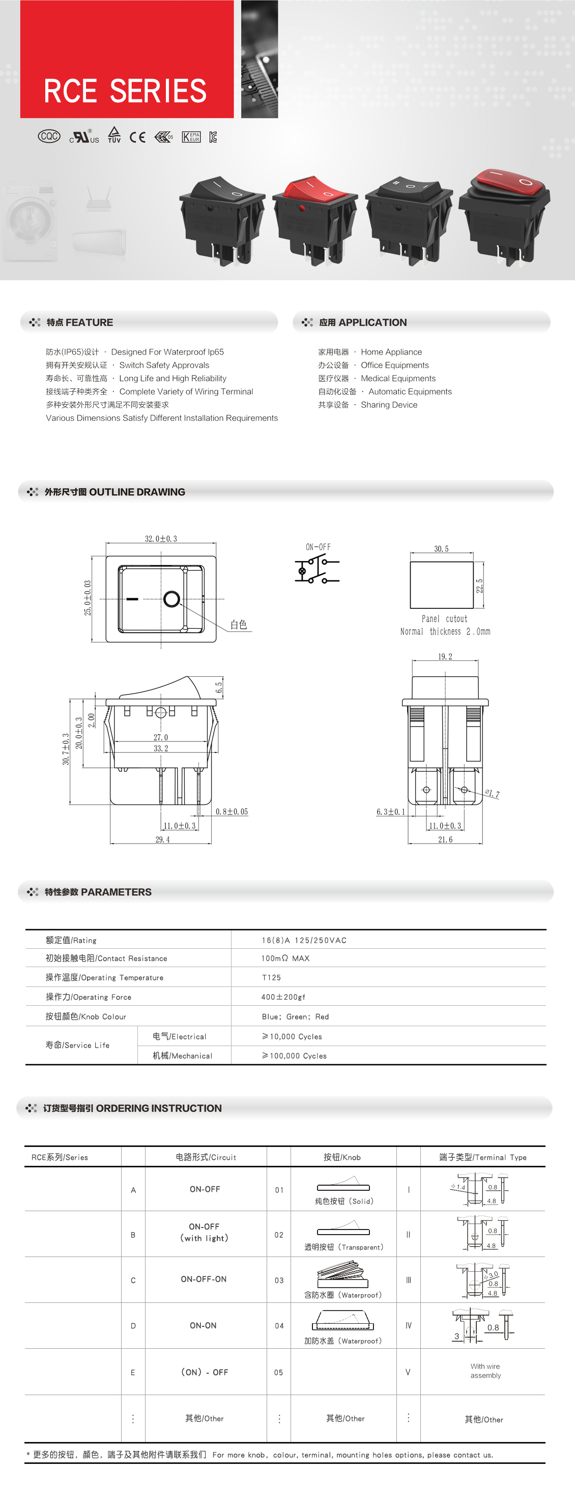 RCE系列 船型开关 方形翘板开关KCD4 双刀双掷ON-OFF带灯