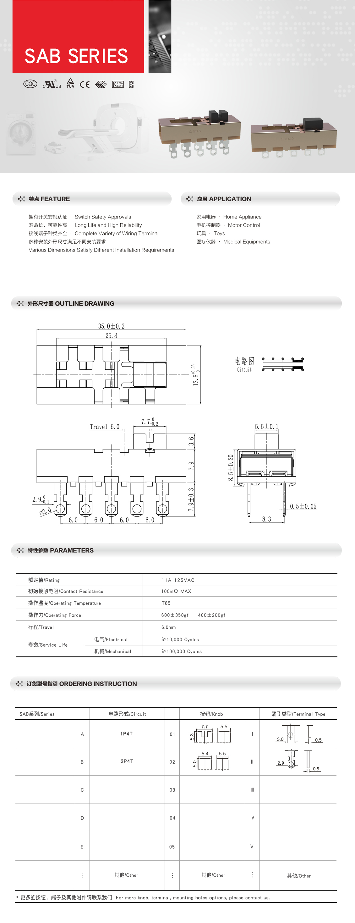 SAB系列 3档拨动开关 8脚双极三位滑动开关